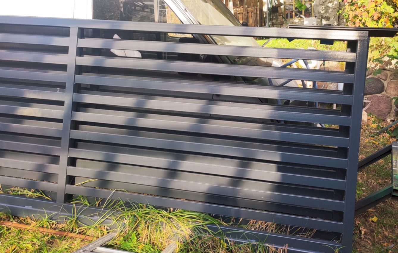 Całość ocynkowana ogniowo i malowana proszkowo grubą strukturą na kolor RAL 7016 (antracyt).